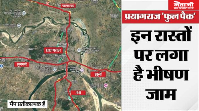 प्रयागराज शहर में भारी यातायात है। महाकुंभ मेला 2025 में भाग लेने के लिए श्रद्धालुओं का वहां पहुंचना जारी है।