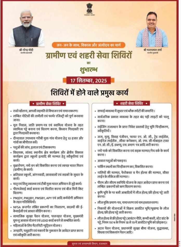 फतहनगर। नगरपालिका फतहनगर सनवाड द्वारा कल यानि 17 सितंबर से 17 अक्टूबर तक “शहरी सेवा शिविर 2025” आयोजित किया जा रहा है। यह शिविर राजस्थान सरकार द्वारा नागरिकों की कठिनाइयों के निवारण, प्रशासनिक सेवाओं के शीघ्र निस्तारण एवं जन समस्याओं के समाधान हेतु जनहित में आयोजित किया जा रहा है।