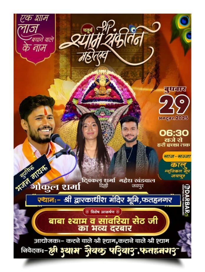 आप सभी से अनुरोध है कि इस भव्य आयोजन में भाग लेकर बाबा श्याम की भक्ति में शामिल हों।