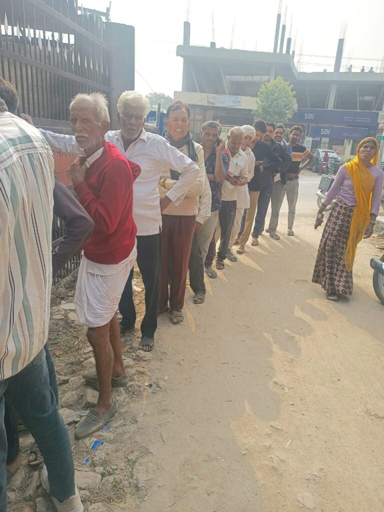 कतारों में खड़े-खड़े कुछ वृध लोगों को थोड़ी -थोड़ी देर के लिए कतार में ही बैठने को विवश होना पड़ा।