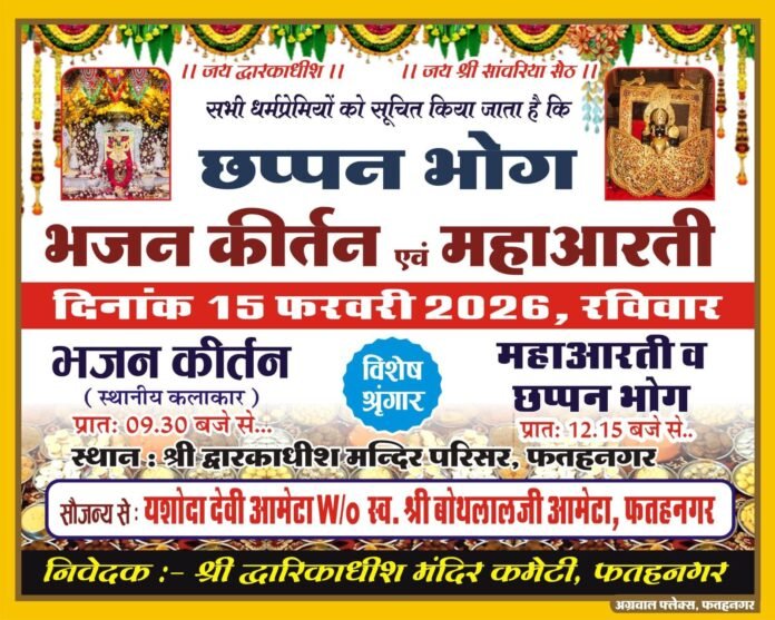 फतह नगरl धार्मिक नगरी फतहनगर में महाशिवरात्रि महोत्सव के पावन अवसर पर रविवार को ठाकुर श्री द्वारिकाधीशजी मंदिर परिसर में छप्पन भोग, भजन-कीर्तन एवं महाआरती का भव्य आयोजन किया जाएगा।