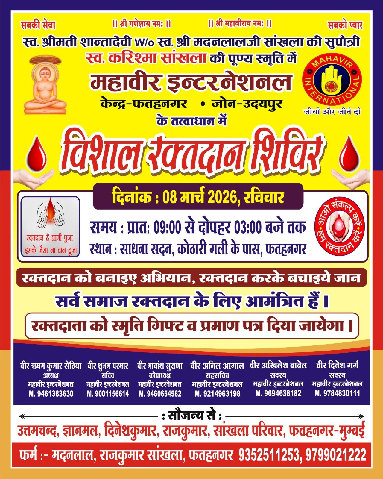 फतहनगर, 6मार्च। समाजसेवा में अग्रणी महावीर इंटरनेशनल शाखा, फतहनगर के तत्वावधान में स्व. श्रीमती शांता देवी (पत्नी स्व. श्री मदनलाल जी सांखला) की सुपौत्री स्व. करिश्मा सांखला की पुण्य स्मृति में 8 मार्च 2026, रविवार को साधना सदन, फतहनगर में विशाल रक्तदान शिविर का आयोजन किया जाएगा। शिविर सुबह 9 बजे से दोपहर 3:30 बजे तक चलेगा। शाखा अध्यक्ष ऋषभ कुमार सेठिया ने बताया कि रक्तदान के दौरान रक्तदाताओं की बीपी व ब्लड ग्रुप आदि की जांच की जाएगी। रक्तदान से पहले जूस व बाद में अल्पाहार की व्यवस्था रहेगी तथा रक्तदाताओं को प्रशस्ति पत्र व उपहार भी भेंट किए जाएंगे। कार्यक्रम में सर्वसमाज को आमंत्रित किया गया है।