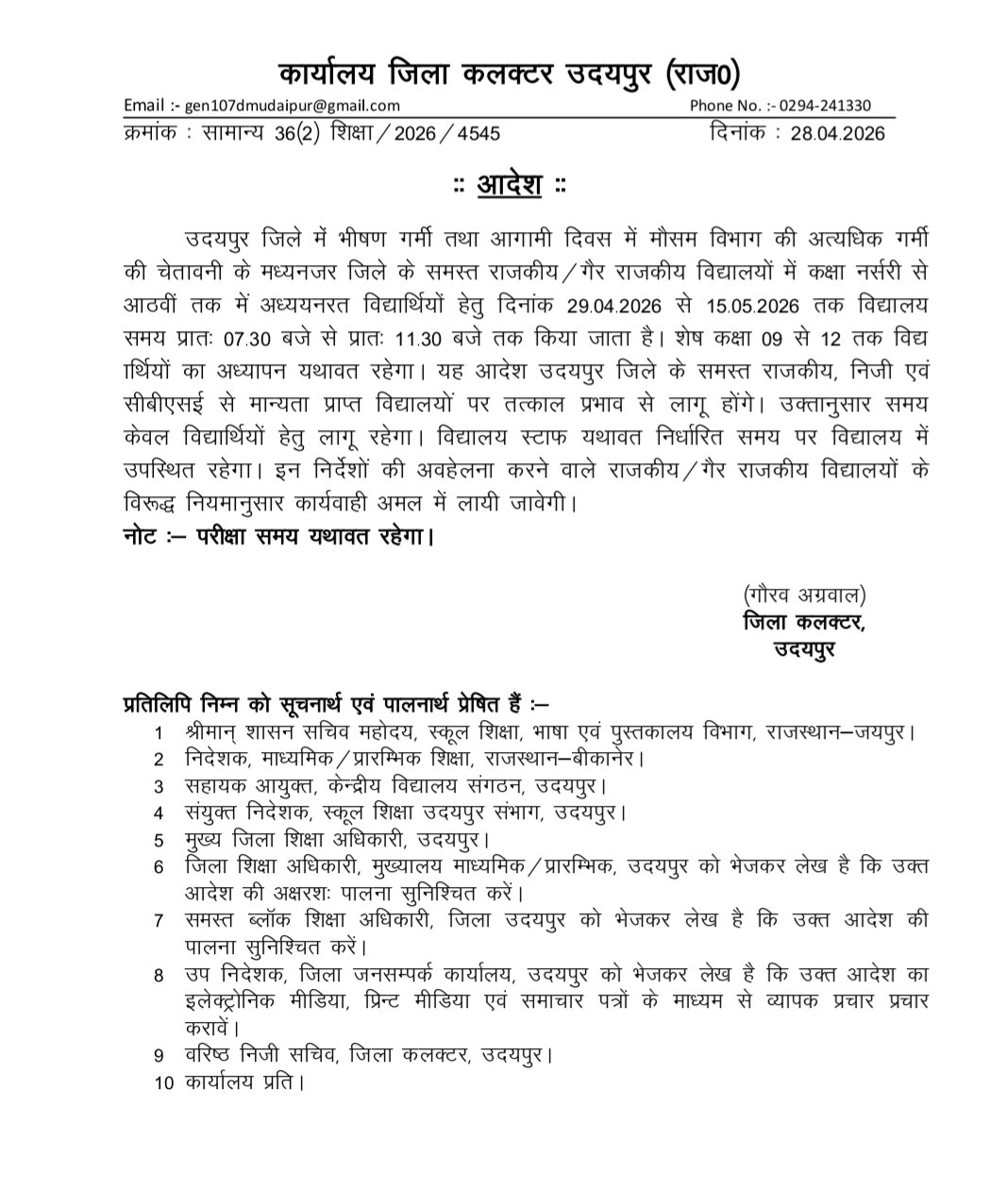 जिला कलेक्टर के आदेशानुसार उदयपुर जिले के सभी राजकीय, गैर-राजकीय एवं सीबीएसई मान्यता प्राप्त विद्यालयों में नर्सरी से कक्षा 8 तक के विद्यार्थियों का समय 29 अप्रैल 2026 से 15 मई 2026 तक प्रातः 7:30 बजे से 11:30 बजे तक निर्धारित किया गया है। कक्षा 9 से 12 तक की कक्षाओं का समय यथावत रहेगा।